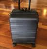 Black 4 wheel carry on, Turkish airline sticker attached to handle. Swiss TSA key lock on a side. Brand Muji.