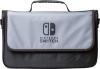 Left a Nintendo case with a Nintendo Switch inside. It is a blank and grey shoulder bag with the word Nintendo across the front. Inside is a second case with a Nintendo Switch with two yellow controllers. The Game has a piece of tape with the name "Mugleston" on it. There is also a plastic container with a number of games inside. |