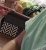 Metallic Pink Apple I-Pad with a black and white chevron case. |