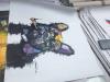 A canvass painting - rolled and covered in plastic wrapping. The painting is of a French bulldog |