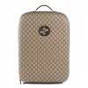 It is a beige carry on with brown dots. It has a tag for Royal Jordanian Airlines with no name on it. Inside, there are clothes and sweets. |