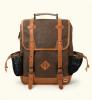 Leather and canvas backpack with 2 straps on the front. There was a MacBook laptop inside. |