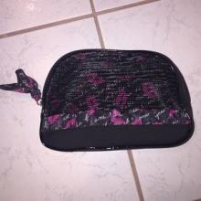 small bag with all cosmetics. Probably Lancôme or Victoria Secret brand. Most items from Lancôme and some from Mac. Probably Fitbit inside too