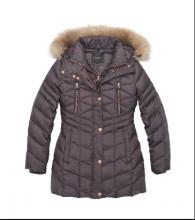 Metallic grey padded women's medium winter jacket with faux fur hood, med to long length. Marc by Marc Jacobs brand name. Has grey cotton gloves in pocket.