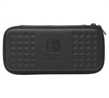 Nintendo Switch neon in Hori black zipped up case with a leather adjustable stand wrapped around it. There is a Super Mario 8 Kart cartridge inserted into the console and Mario Odessey cartridge in the poach slot in the case.