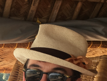 It is a light colored straw hat with a brown ribbon around the perimeter. The brown ribbon is part of the original hat. But to this ribbon, on one side, I tied a piece of orange colored cloth, which should distinguish the hat from all others.