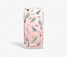 I Phone 6S Plus, Clear case with Parakeets on it. In between the case and the phone there is an opal card (travel Card)