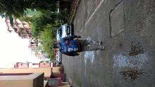 It is red and blue backpack with multiple pockets. It has a bottom compartment for shoes, two compartments in the front, one to carry a few clothes and finally one to carry laptop. In the front compartment, there is a paper slip inside the net pocket with the details of the passenger - Name: Sanatan Lahkar, Address - 205, Anubhav Apartment, Basisthapur Bylane - 3, Guwahati, Assam, India; Contact no., Emergency contact no. and blood group. It also carries a green folder with documents like tickets, hotel booking confirmations, tour bookings, airport shuttle bookings, etc.