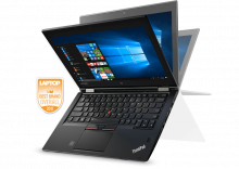 black Lenovo ThinkpadYoga touch screen lap top left on a table next to empty bins at the security checkpoint for connecting flights (all gates). The computer was left there around 3 p.m.