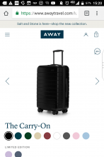 "Away" brand carry-on rolling suitcase. Black. Contains two pairs of white men's pants, an empty camera bag, a small pouch containing electronic connecting wires (USB, etc) among other things.