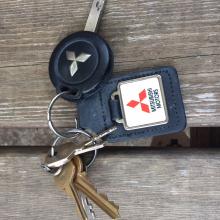 A set of Mitsubishi car keys with Key Fob and with a front door key (Darth Vadar design) attached. Very similar to the keys in the attached photo.