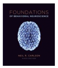 Black softcover textbook with the title "Foundations of Behavioral Neuroscience" by Neil R. Carlson with a picture of a blue brain on the cover as well.