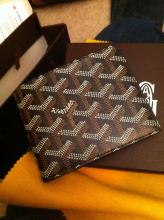 Brown (brand: goyard) slim wallet with red debit card and ID (name: Hans Kieckhefer)
