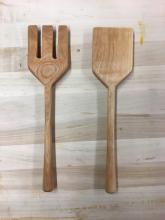 A set of two wooden spoons. Golden in color. One solid, the other three pronged