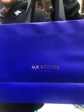 A brand new pair of womens shoes in a deep blue/purple bag with the label Aquazzura written on the front. Left in the American Airlines Flagship lounge JFK Terminal 8 last night.