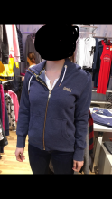 What: Hoodie jacket with zipper Brand: superdry Color: blue hoodie; white ribbon; gold appliqué with „superdry“ on chest
