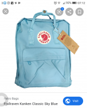 Pale blue Kanken bag containing UK PASSPORT, scarf, small black shoulder bag, portable charger, photocopy of passport and ESTA.