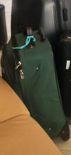 A small green coloured carry on suitcase. It has children’s books, and few purses, as well as a paper bag of prescribed medications.