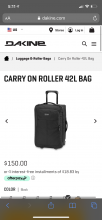 Black carry on size Dakine suitcase, 2 roller wheels with my info on an ID card that can be accessed by a tab on the side.