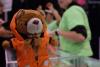 Small teddy bear in an orange survival suit. |
