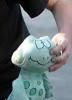 A fabric frog bath doll. It is a light green color with darker green spots on its stomach. The face and spots are painted on and the paint on the face is chipped and the paint for the pupils has worn away so it has half of one pupil left. It is smiling and the head is the largest part of the doll. The fabric is thin and there are numerous stitchings all over the doll, including on the leg. It is around 1 foot long and is stuffed with foam but only partially so the limbs hang. |