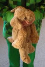 mid brown soft toy-doggy, about 12”long. black beads for eyes, very loved a bit scruffy