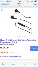 Bose in-ear noise cancelling headphones. Black with blue lines and white ear tips.