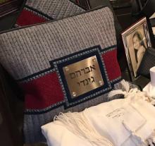 Bag is Blue with Hebrew lettering. Approximately 18"x18"