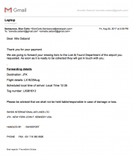The laptop was lost on 8/21 and found at Zurich Airport under the record number F-2017/32249. Against payment of a fee, the laptop was forwarded to JFK Airport on 8/26 on flight LX016 under tag number LX981613. The Swiss representative indicated that I would be contacted by JFK Lost and Found. I have not yet heard from you and would like to make pickup arrangements as soon as practicable. Kindly let me know what I can do to facilitate the process. Thank you.