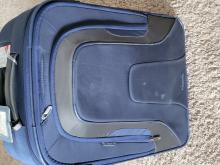 Navy Blue small (approximately 21x14x10 inches) Tumi carry-on suitcase with Delta silver medallion tag, picture nametag (2.5x4 inches) & regular leather name tag. Please note that the picture is of the medium bag in the set, but that one looks identical to the missing bag