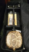 A music instrument like a traditional guitar (Sanshin) with three strings in a green camouflage colored soft case. I’ve left behind it at the X-ray security check machine at the terminal 1.