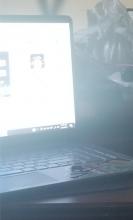 Gray laptop with alot of different stickers on the front, and both corners of keypad when opened..still has USB chip in it for mouse