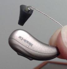Hearing aid. Bronze in color with red dot where ear wire connects to hearing aid. Miracle Ear brand.