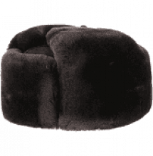 Brown muskrat fur Russian-style hat with a vertical front flap and side and rear flaps which can be folded down.