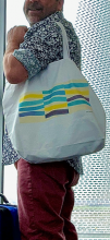 The bag that I lost was an off white canvas bag with an abstract yellow and blue painting with the name Kim Uchiyama printed on the front side. Inside of the bag was a black I-phone charger, Flonaise, masks, a pair of reading glasses and a pair of perscription glasses in a light grey case.