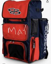 Red softball backpack bag. Two bats are taped to secure them to the bag. Contents include helmet, cleats, glove, tennis shoes. Should be tagged with my information on it. Currently the baggage tag would be Flight 0199 from Milan to JFK on 17.06.2023. Front of bag says MAY #1