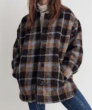 A brown and blue plaid coat/jacket, wool-like material outside and lined dark brown inside, has brown buttons. There were 2 disposable film cameras in the pockets.